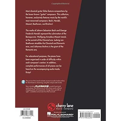 (Guitar). Most classical guitar folios feature compositions by the lesser-known "guitar" composers. This collection, however, exclusively features music by the world's most renowned composers. The works of Johann Sebastian Bach and George Frederick Handel represent the culmination of the Baroque era. Wolfgang Amadeus Mozart stands at the summit of the Classical era. Ludwig van Beethoven straddles the Classical and Romantic eras, and Johannes Brahms is the giant of the Romantic era. For educational purposes, the pieces have been organized in order of difficulty within each composer's section. In addition, complete performances of all pieces can be heard on the accompanying audio. Enjoy! Includes: Jesu, Joy of Man's Desiring * The Harmonious Blacksmith * Ode to Joy * Lullaby * and more. Audio is accessed online using the unique code inside the book and can be streamed or downloaded. The audio files include PLAYBACK+, a multi-functional audio player that allows you to slow down audio without changing pitch, set loop points, change keys, and pan left or right.